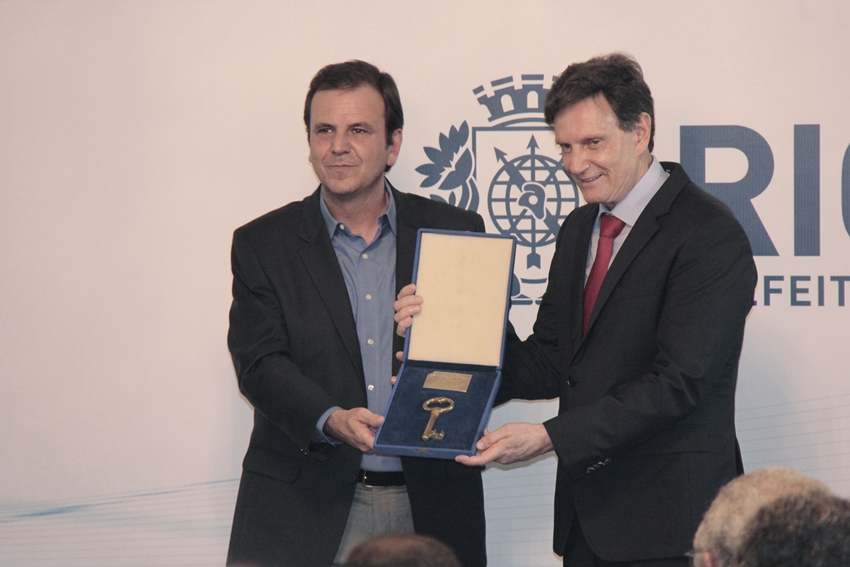 “Espero que sua equipe possa avançar em temas que não fizemos e ajustar o que for necessário. O que eu puder colaborar para que o seu governo seja melhor que o meu eu irei fazer. Desejo todo o sucesso”, disse Paes, que logo após entregou a Crivella a chave da Fortaleza de São João (Urca), onde a cidade foi fundada por Estácio de Sá. Desta forma foi simbolizada a passagem do cargo, que não ocorria deste 1996.