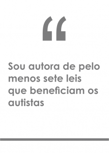 TANIA BASTOS – É muito gratificante poder ajudar estas pessoas a ser reconhecidas e respeitadas pela sociedade. Sabemos que os autistas carecem de atenção especial por conta da precariedade e ineficiência dos serviços oferecidos pelos órgãos públicos. Sou autora de pelo menos sete leis que beneficiam a classe – causa que sou madrinha. Entre elas, incluem: diagnóstico precoce; atendimento multiprofissional; acesso à educação e ao mercado de trabalho. Todo o meu esforço é para conscientizar a população da importância de saber identificar e respeitar estas pessoas.