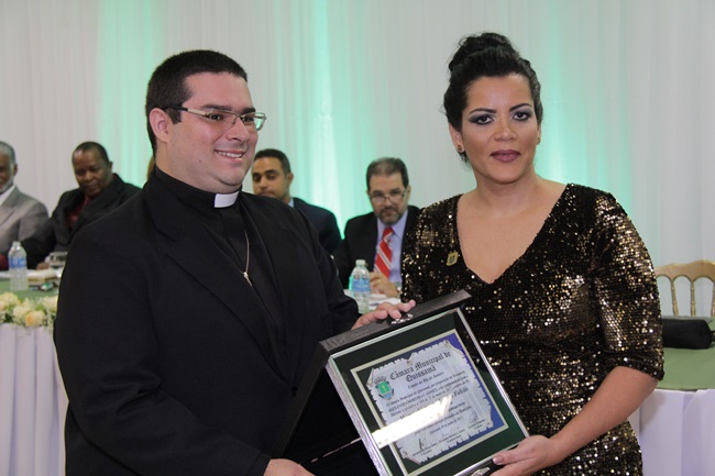 A vereadora Alexandra Moreira de Carvalho Gomes entregou o mesmo título ao padre Marcus Vinicius Moreira Falcão, que em 2013 assumiu a Igreja Matriz de Nossa Senhora do Desterro. “Minha família de sangue não pode estar nesta noite, mas vejo aqui a família que Deus me deu, sendo representada pelos meus queridos paroquianos. Sinto-me um verdadeiro pigmeu diante de tantas autoridades. Muito obrigado a minha querida Alexandra e a todos os conterrâneos quissamaenses”, disse o padre.
