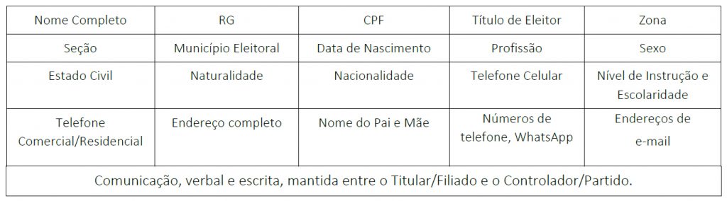 - Possibilitar que o Controlador/Partido, em sua esfera de atuação, identifique e entre em contato com o Titular/filiado para fins de relacionamento intrapartidário;